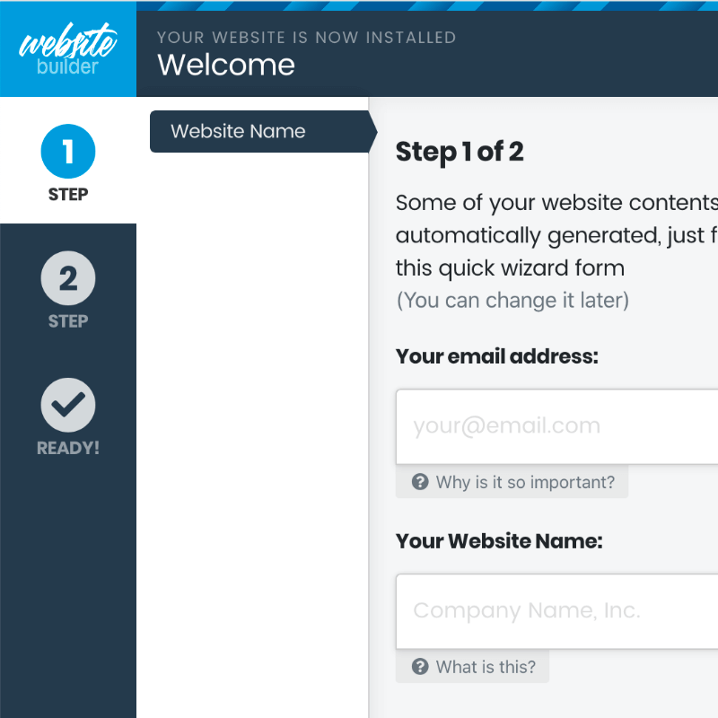 Your new website welcomes you with "Welcome Screen", it's where you enter your basic information, like website name, email or company/contact information and it'll automatically prepare "contact us" and privacy policy subpages for you.
